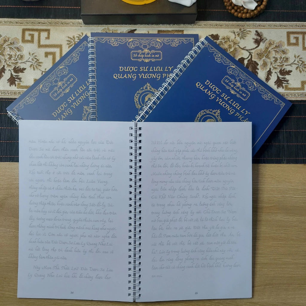 - Sổ tay chép kinh Dược Sư Lưu Ly được biên soạn in mờ chữ Việt vô cùng thuận tiện.