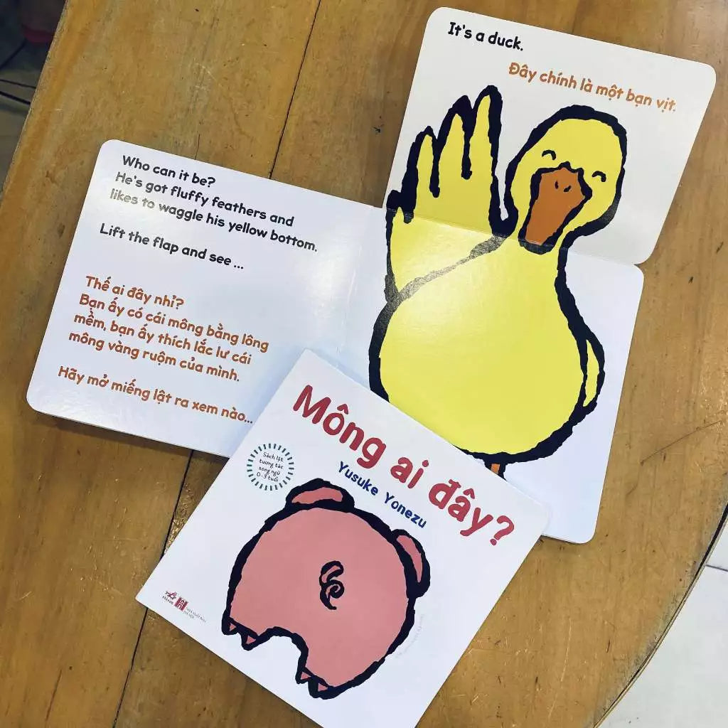 Bộ sách lật tương tác song ngữ 0-3 tuổi được thiết kế hoàn toàn phù hợp với các yêu cầu trên cho trẻ bé. 5 cuốn sách trong bộ này chính là những món đồ chơi giàu tính tương tác. Sách in giấy rất dày dặn, có cán láng mịn màng, mỗi cuốn đều có nhiều miếng lật theo nhiều chiều khác nhau để trẻ rèn thao tác tay, và đề tài của sách thực sự thú vị với lứa tuổi 0-3. Trẻ ở tuổi này sẽ không thể không bị hút mắt bởi cuốn sách Ú òa, sách Mông ai đây dạy trẻ nhìn mông đoán hình ảnh con vật, sách 5 quả táo nhỏ đếm số quả táo và dạy về thức ăn của các loài vật quanh trẻ, sách Mẹ đâu rồi dạy trẻ nhận biết các cặp mẹ con trong thế giới động vật, và cuốn sách Chúc ngủ ngon ru trẻ ngủ. Mỗi cuốn sách tưởng chừng rất đơn giản nhưng lại được thiết kế kỹ càng, tông màu và hình ảnh hợp với chủ đề, miếng lật giở theo nhiều chiều chứ không đơn điệu, đề tài thì gắn bó chặt chẽ và rất thiết thân với tâm lý lứa tuổi trẻ.