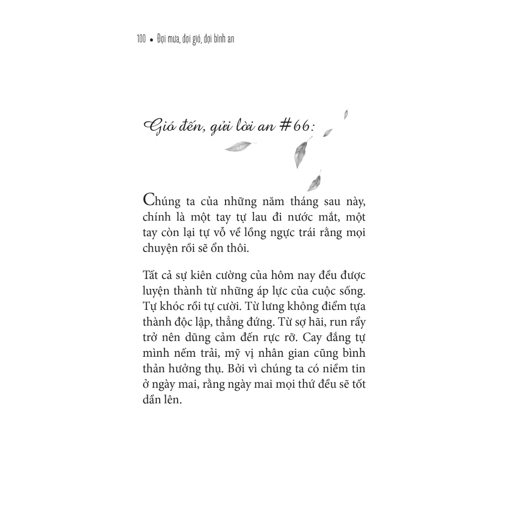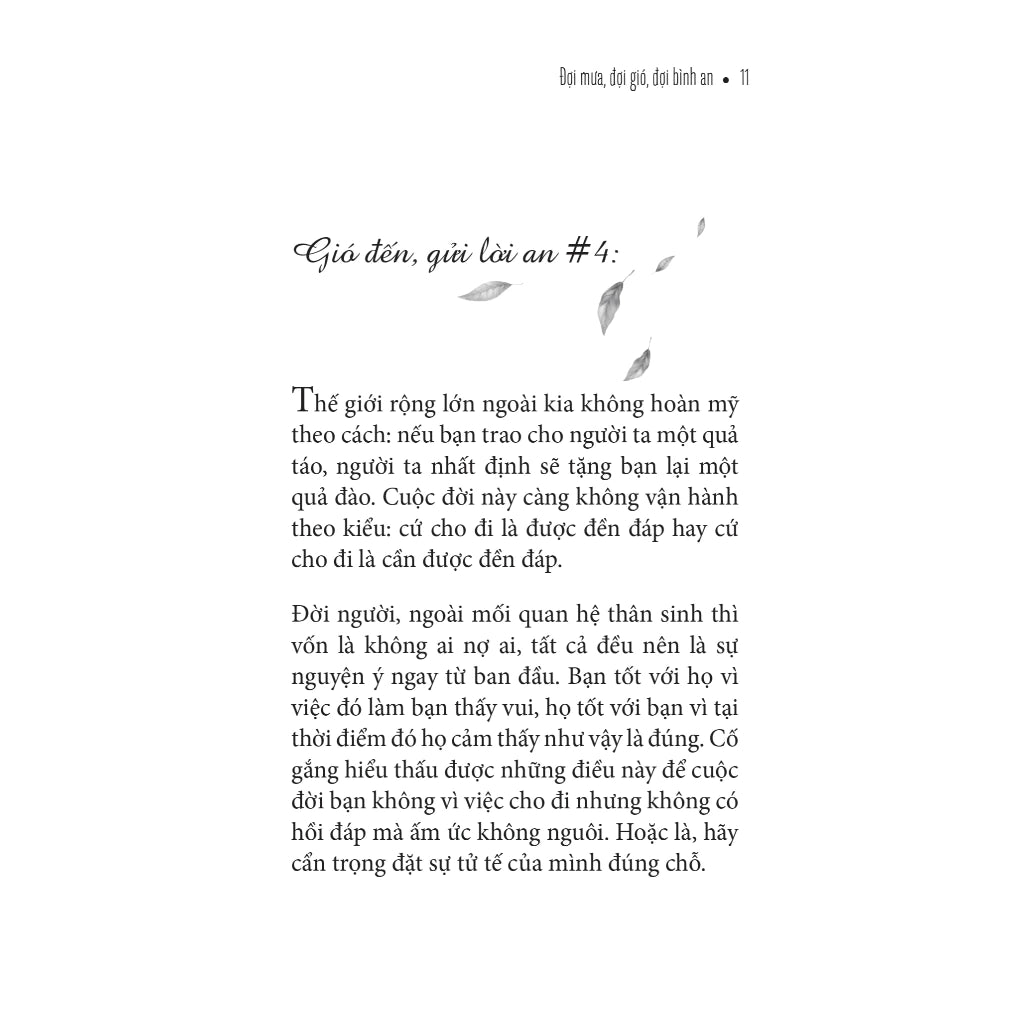 Chứa đựng những bài học kinh nghiệm mà tác giả tích lũy được trong đoạn hành trình tìm lại bản thân sau tất cả những thăng trầm được - mất, “Đợi mưa, đợi gió, đợi bình an” trân quý gửi trao đến bạn 165 lời an, để ai có duyên đọc được nó sẽ nhẹ nhàng kinh qua mưa gió của kiếp người, tìm được chốn dừng chân yên ả.