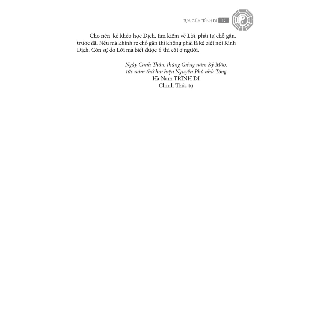 Dịch là biến đổi, tức là tùy thời biến đổi để theo Đạo. Nó là thứ sách rộng lớn đầy đủ, hầu thuận theo lẽ số mệnh (tính mệnh này chỉ về tính chất số mệnh, không phải chữ tính mệnh chỉ về sinh mạng), thông đạt cớ u minh, hiểu hết tình trạng muôn vật mà bảo những cách mở mang các vật, làm thành các việc.