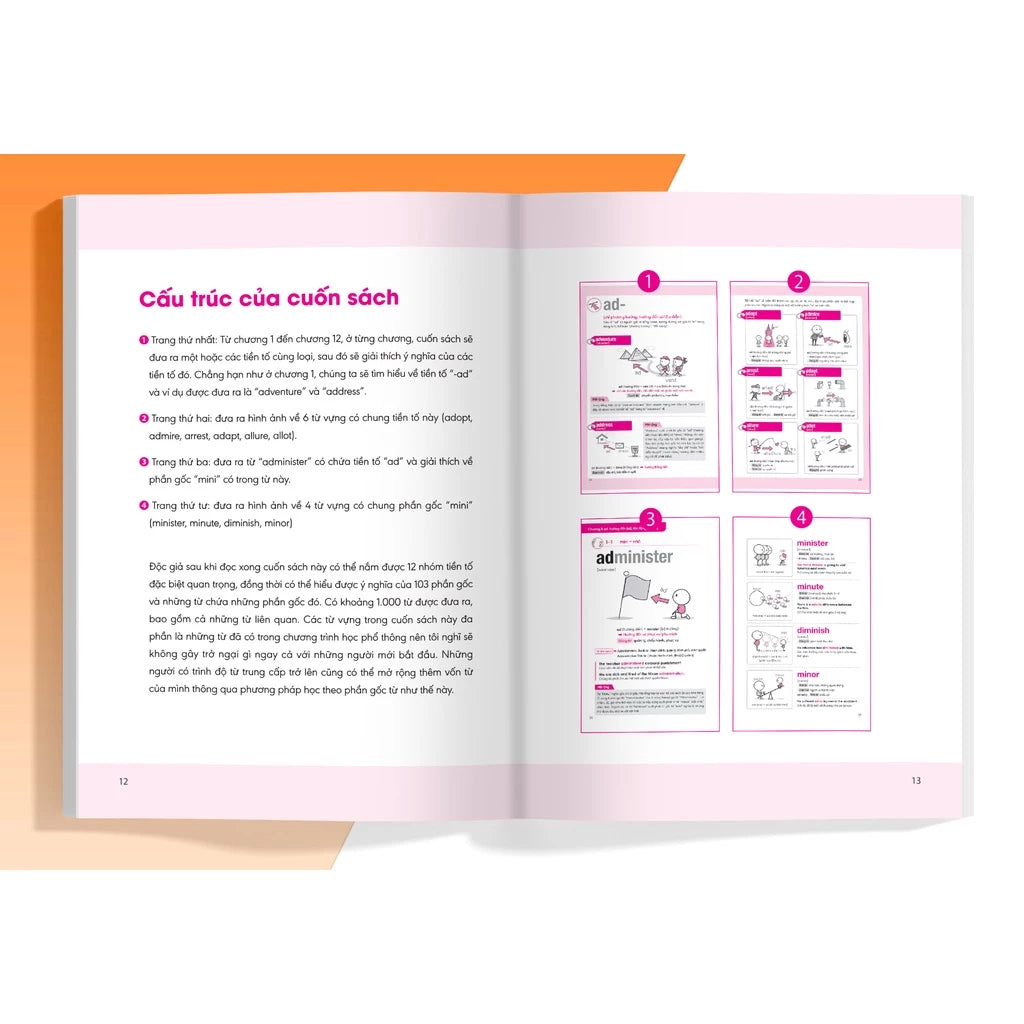 Trang thứ 3 đưa ra 1 từ vựng và giải thích gốc từ của nó. Ví dụ: “administer” có chứa tiền tố “ad” và gốc “mini”.